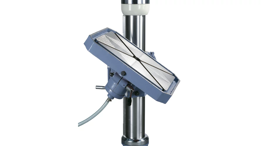 Elfordítható munkaasztal (± 45°) diagonálisan futó T-hornyokkal és hűtőanyaghoronnyal.