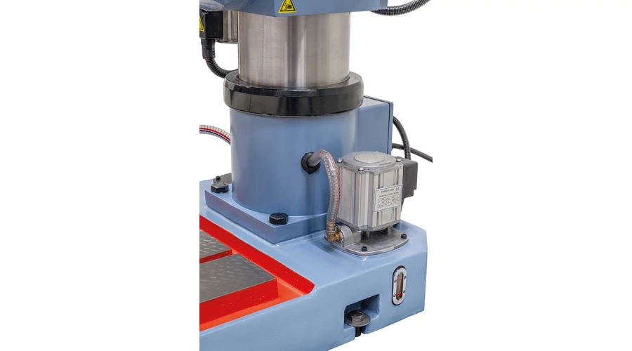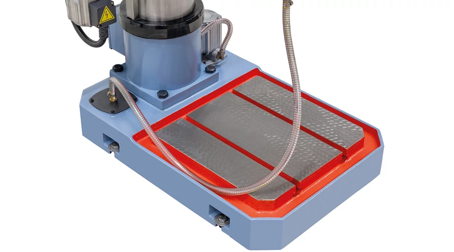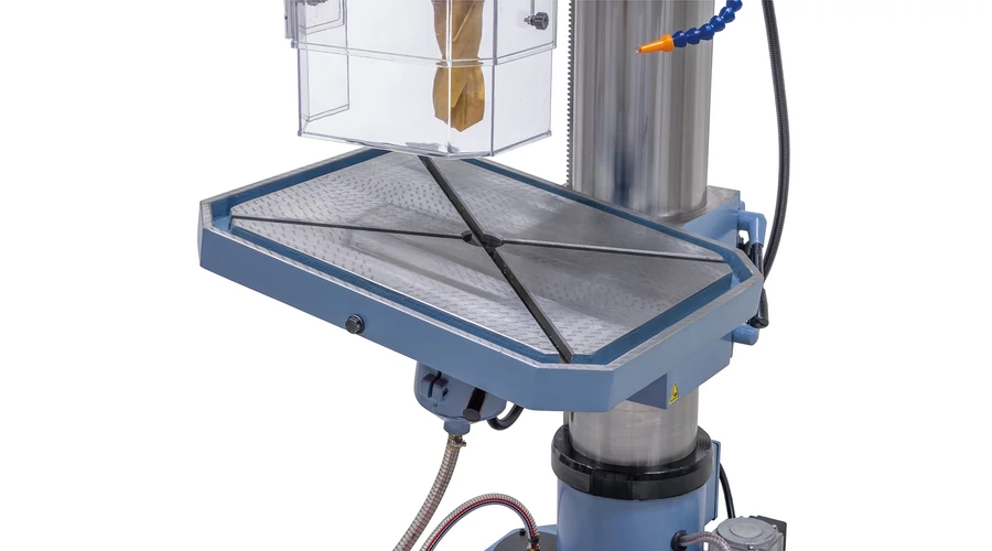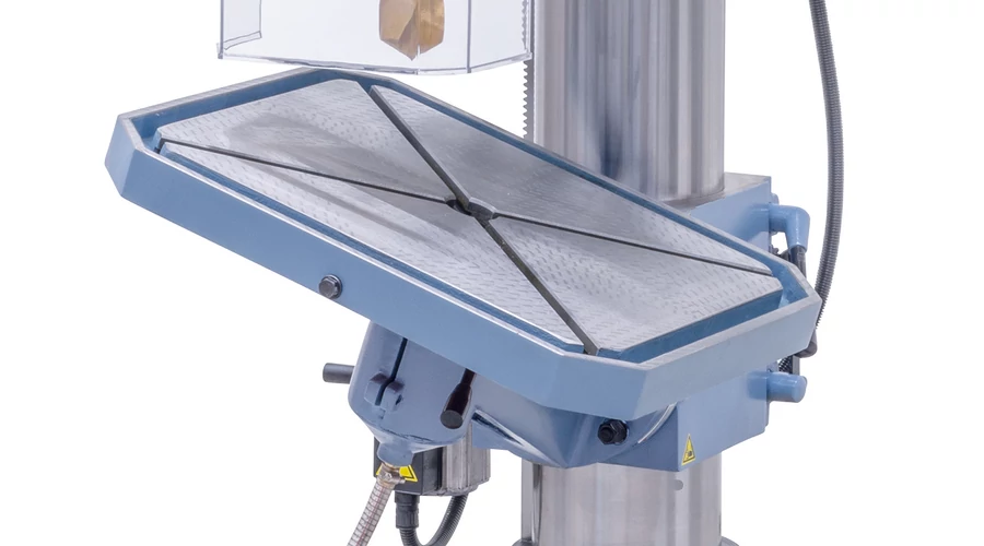 Kézzel hántolt fúróasztal masszív szürkeöntvényből, elfordítható -45°-tól + 45°-ig.