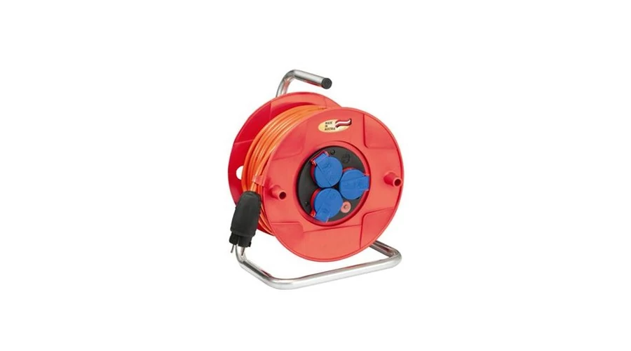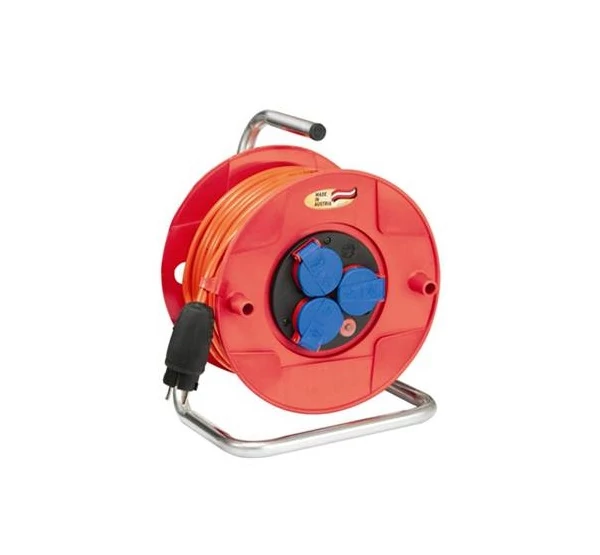 Ipari minőségű, kültéri, narancs színű kábeldob 25 m-es kivitelben 3 db elosztóval. |