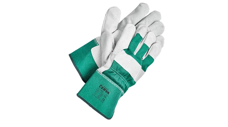 Profi minőségű, ipari célokra is alkalmas, kombinált védőkesztyű vastag, marha, hasított bőrből, bélelt tenyérrel, pamut kézfejjel és teljesbőr hüvelyk- és mutatóujjakkal valamint körömvédővel ellátva zöld színben és 12-es méretben.