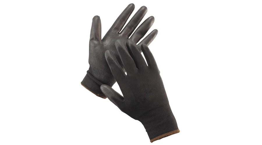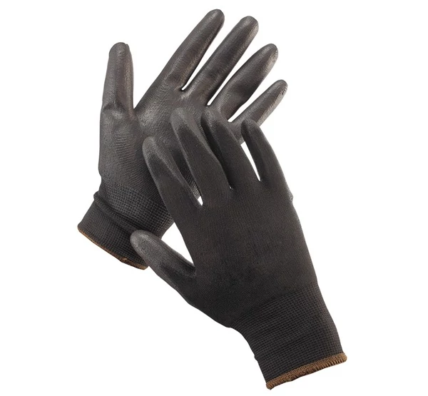 Kötött, PES anyagból készült védőkesztyű PU mártott tenyérrel a csúszás elleni védelem érdekében, továbbá rugalmas és kényelmes mandzsettával van ellátva, 9-es méretben.