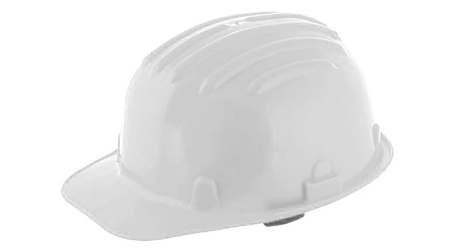 Fehér színű, HD polietilén anyagból készült munkavédelmi sisak. |