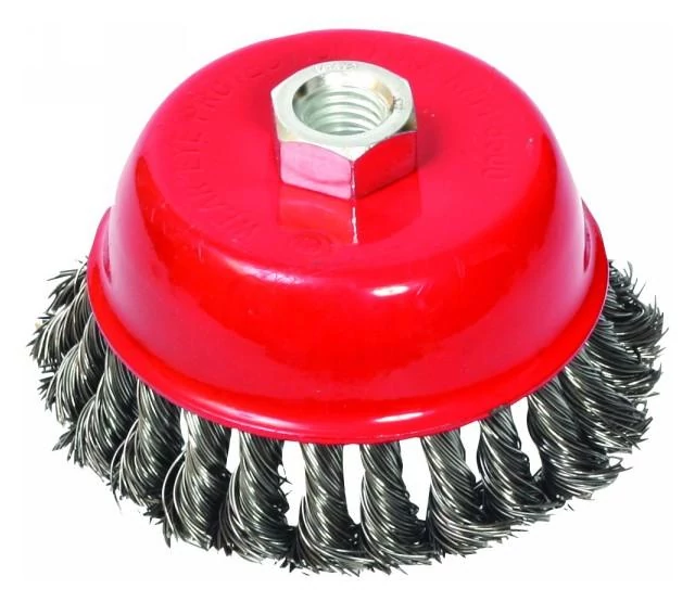 100 mm átmérőjű acélból készült, sodrott fazékkefe. Alkalmas fém felületeken történő rozsda, festék, lakk eltávolítására, csiszolásra és tisztításra. Fúrógépeken és gyorsan forgó elektromos szerszámokon való használatra. |