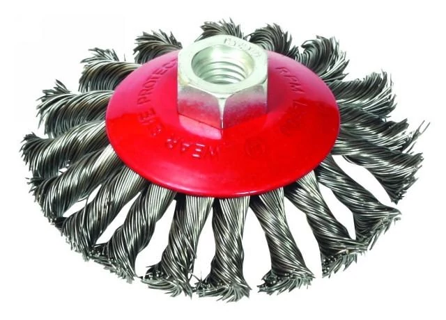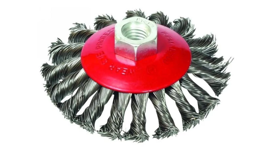 100 mm átmérőjű, rozsdamentes acél drótból sodrott, döntött körkefe M14-es menettel. Alkalmas fém felületeken történő rozsda, festék, lakk eltávolítására, csiszolásra és tisztításra. Fúrógépeken és gyorsan forgó elektromos szerszámokon való használatra.
