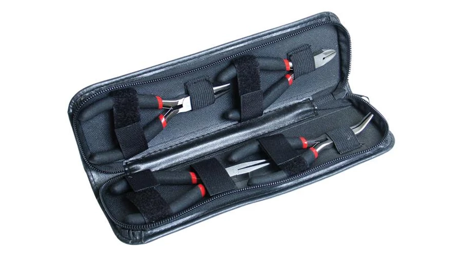 Mini fogókészlet, mely 4 db, 110 mm-es szigetelt, műszerész és csípőfogóból áll. A készlethez egy cipzáras, fekete hordozótáska is tartozik tépőzáras rögzítéssel.