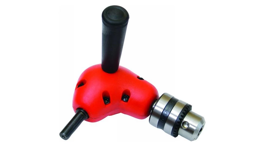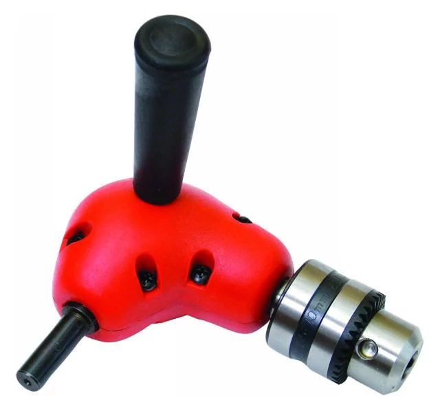 Sarokfúró, -csavarozó 90°-os fúrásokhoz és csavarozáshoz. Nagy segítséget nyújt a nehezen, vagy nem hozzáférhető helyeken. Praktikus és egyszerű használat, strapabíró, műanyag burkolattal, valamint fogaskoszorús, fém tokmánnyal.