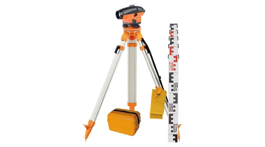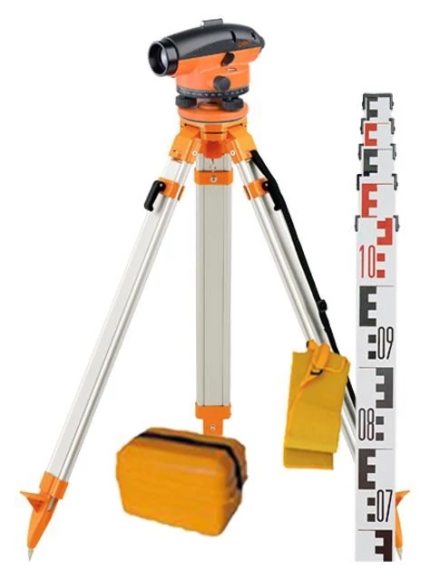 Professzionális, ipari felhasználásra készült, optikai szintező alumínium állvánnyal, teleszkópos szintezőléccel és tároló zsákkal a szintezőléc számára.