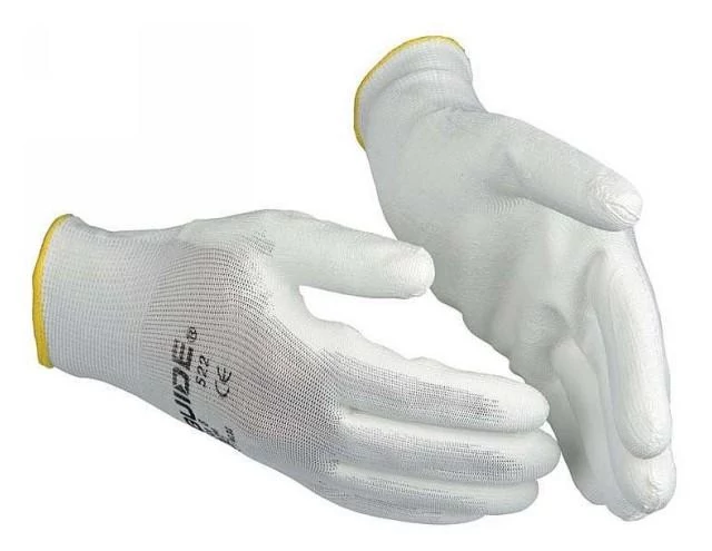 Varrásmentes, fehér, poliészter védőkesztyű könnyű munkákhoz. Poliuretánba mártott tenyér és ujjvégek a biztos tapadás érdekében. Szintetikus alapanyagból és poliuretánból készült. Megfelel a CE követelményeknek és szabványoknak.