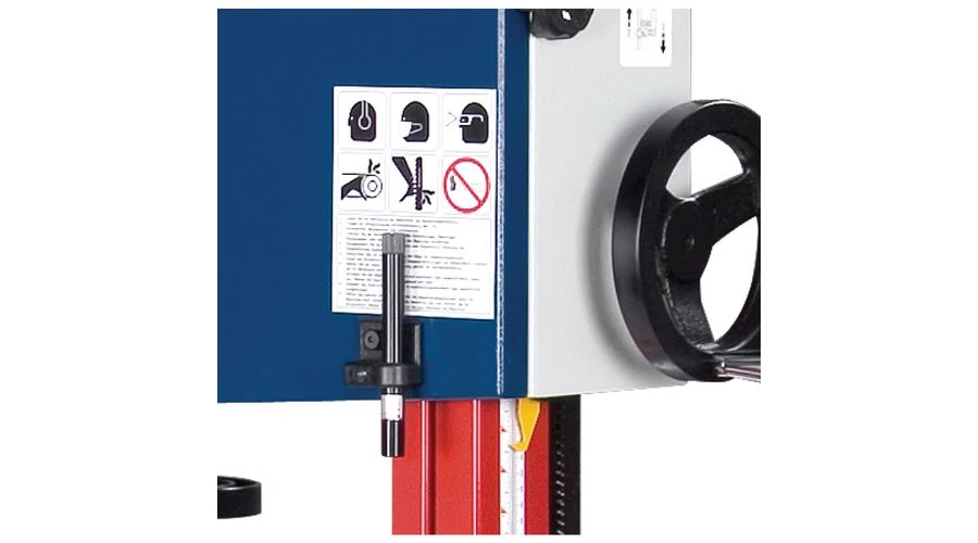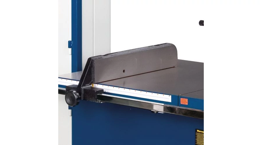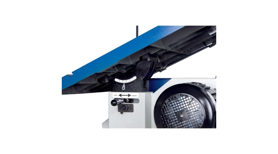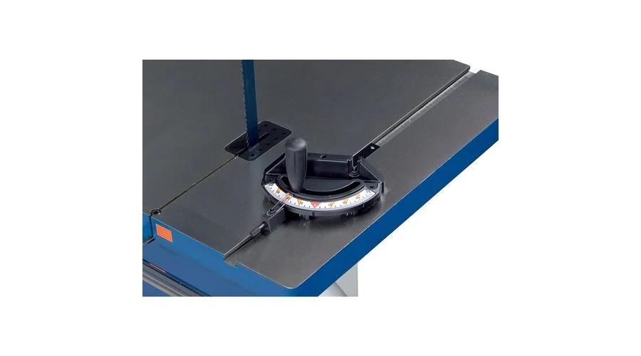 A nehéz, tömör szürke öntöttvas fűrészasztal könnyen és kényelmesen állítható a kézi keréktartón keresztül.