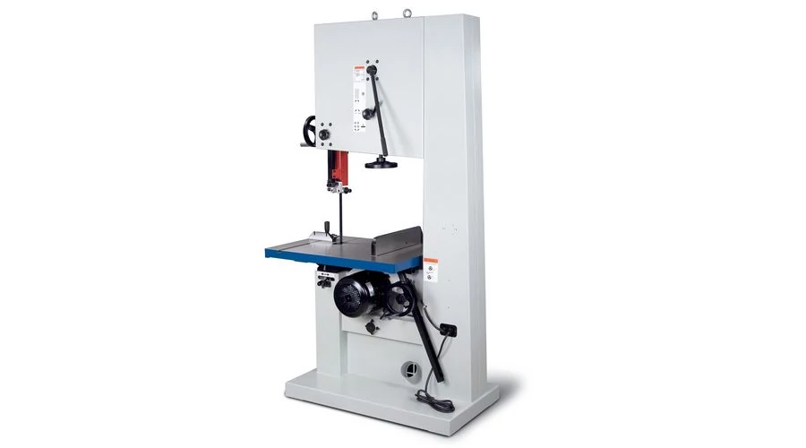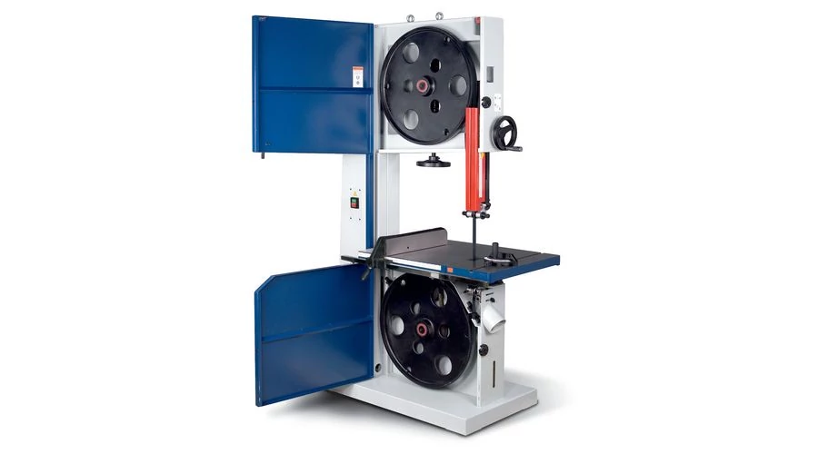 Faipari szalagfűrész vertikális kivitelben, magas felszereltséggel és teljesítménnyel különböző anyagok darabolásához. |