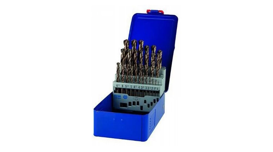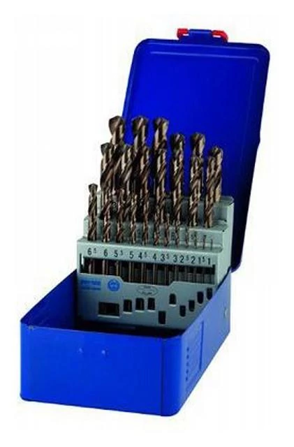 Nagy kopás- és hőellenállású, kobaltos csigafúró készlet fém dobozban. 25 db fúrószárat tartalmaz 1-13 mm-es méretekben. Tökéletesen alkalmas rozsdamentes acél anyagok fúrásához. Átmérők: 1; 1,5; 2; 2,5; 3; 3,5; 4; 4,5; 5; 5,5; 6; 6,5; 7; 7,5; 8; 8,5; 9; 9,5; 10; 10,5; 11; 11,5; 12; 12,5; 13 mm.