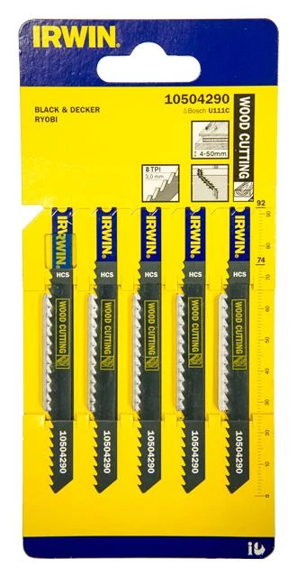 HCS anyagminőségű, 100 mm hosszú dekopírfűrészlap fára, U-szárral. Fogosztás: 8 TPI. A csomag 5 db fűrészlapot tartalmaz.