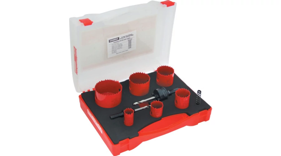 A készlet tartalmaz 6 db váltott fogosztású bimetál lyukfűrész edzett élekkel, 2 db felfogószár és 1 db kilökőrugó.