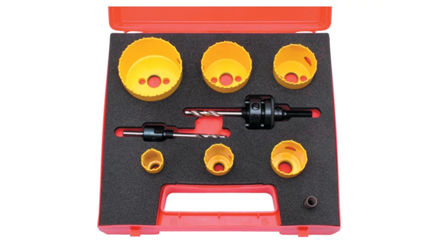 A készlet tartalmaz 6 db állandó fogosztású bimetál lyukfűrészt hegesztett, HSS élekkel, 2 db felfogószárat és 1 db kilökőrugót.