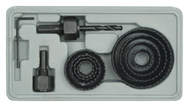 11 részes körkivágó készlet műanyag dobozban 18-63 mm átmérőjű körkivágókkal. A készlet tartalmazza a fúrószárat, két befogót, szerszámkulcsot és a körkivágókat. |