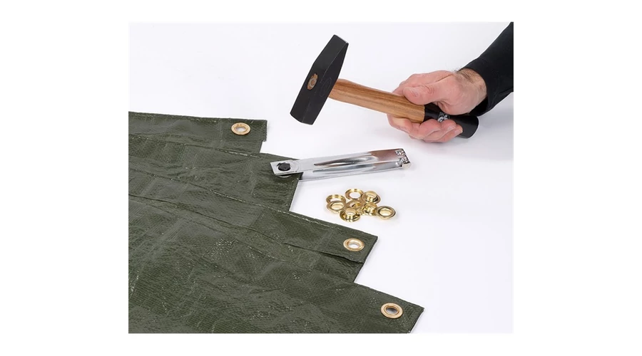 A készlet tartalmaz egy ponyvakarika lyukasztót és 10 db, réz ponyvakarikát.