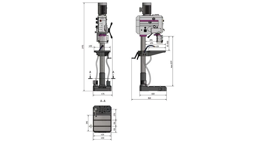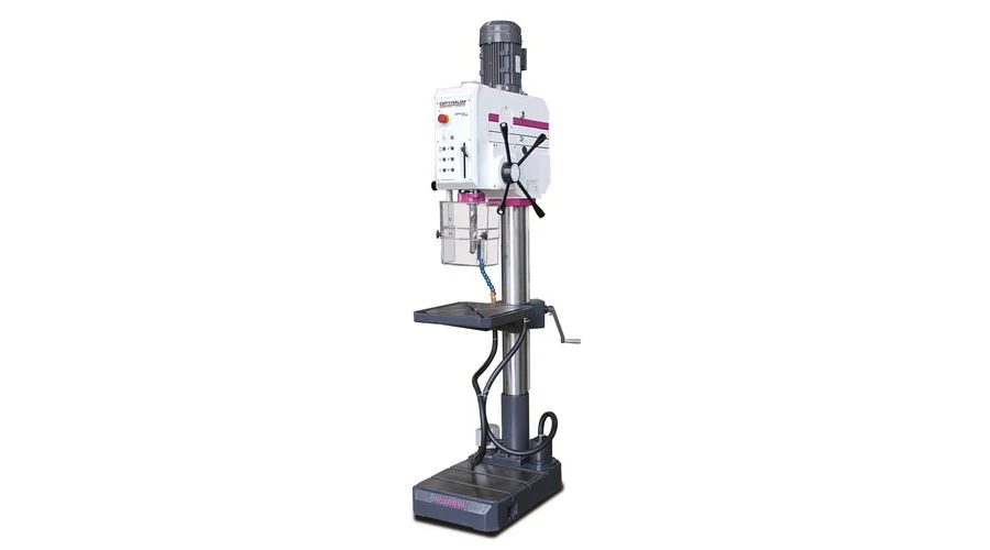 Ipari nagyteljesítményű oszlopos fúrógép 2,2 kW-os, 400 V-os motorral és maximum 35 mm-es fúrási kapacitással. |