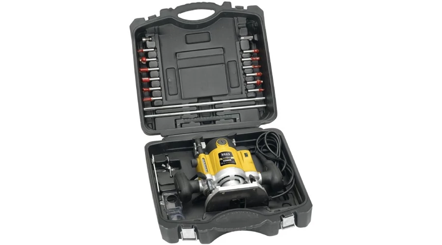 Profi barkácsolóknak készült felsőmarógép 55 mm vágási mélységgel, 12 db marófejjel. |