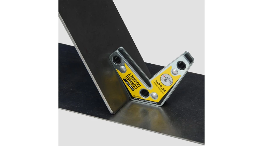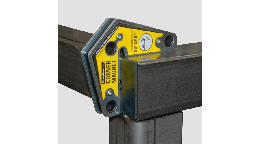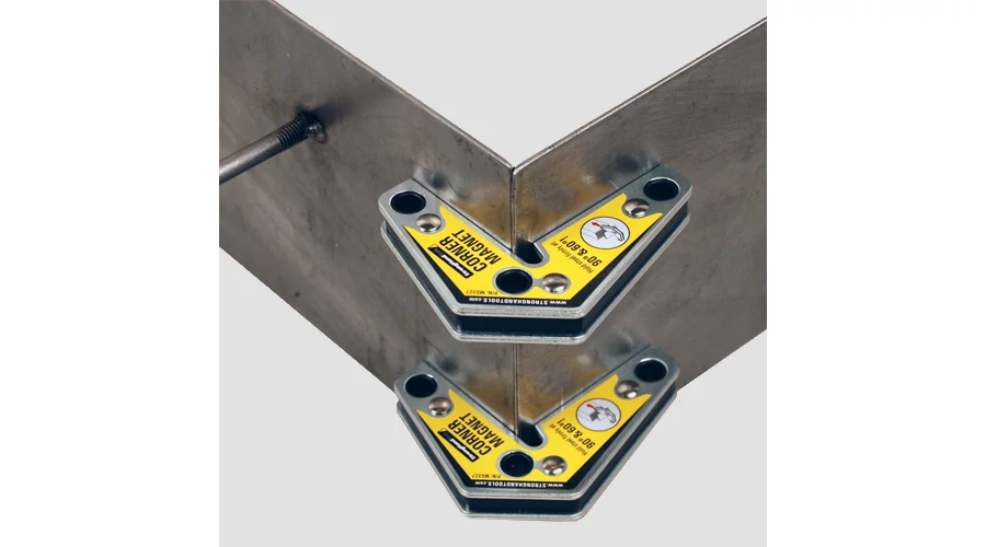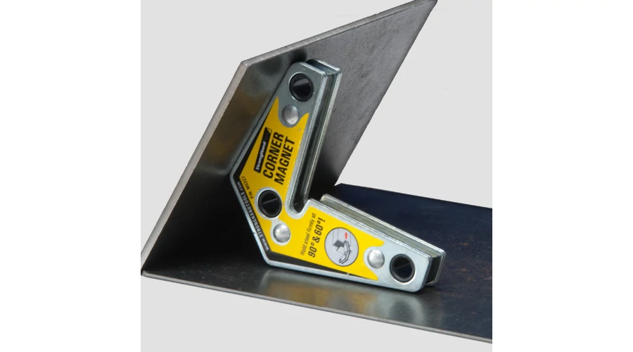 Időtakarékos, mágneses, rögzítő szerszám ipari felhasználók, lakatosok és hegesztől számára. A külső élekkel 90° és 120°-os szögeket is képes biztosítani, ezáltal akadálymentesen végezheti a ponthegesztést és egyéb munkafolyamatokat. Az egyik oldali sarok kivágás lehetővé teszi a magas peremekhez való hozzáférést is. A sarokmágnes külső éleit használva, a munkadarabok 60°-os szögbe állítása is lehetővé válik. Megjegyzés: a mágneses húzóerő, a mágnes hosszanti oldalán és 3/8"-os lemezen alapul.