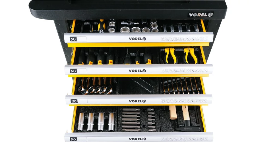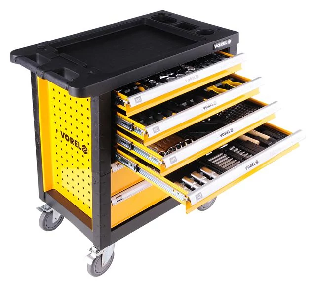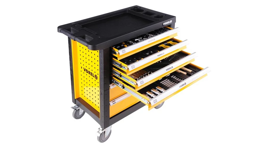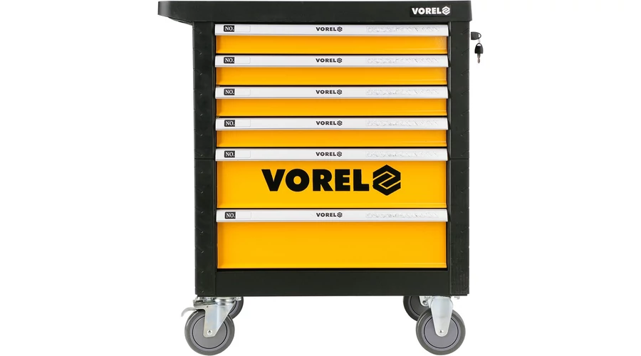 Minőségi szervizszekrény VOREL szerszámokkal és 6 db fiókkal. Golyóvezetős sínekkel ellátott fiókokkal rendelkezik, valamint 12 műanyag modullal is fel van szerelve.