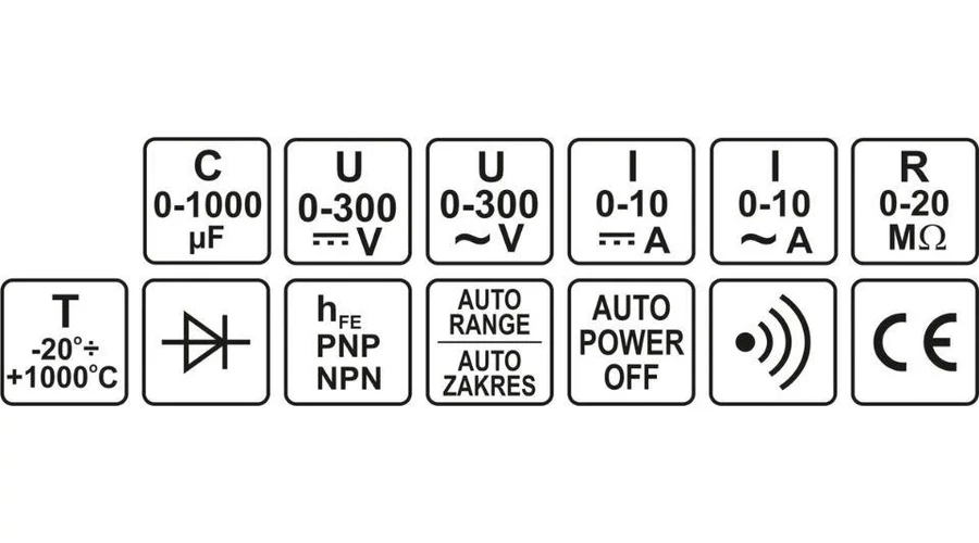 | Kapacitásmérés | 0 - 1000 μF ± 8% |