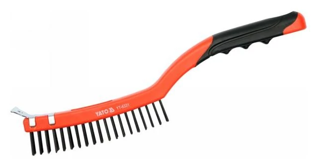 Horganyzott, rugalmas acélhuzalból készült 3 soros drótkefe műanyag nyélhez rögzítve. Acél kaparóval van felszerelve ezzel növelve a tisztítási hatékonyságot.