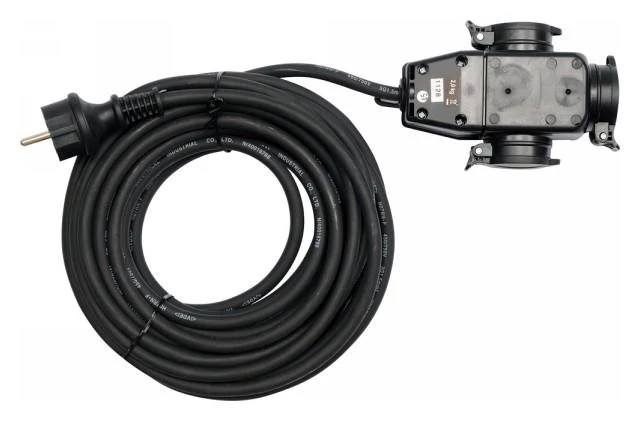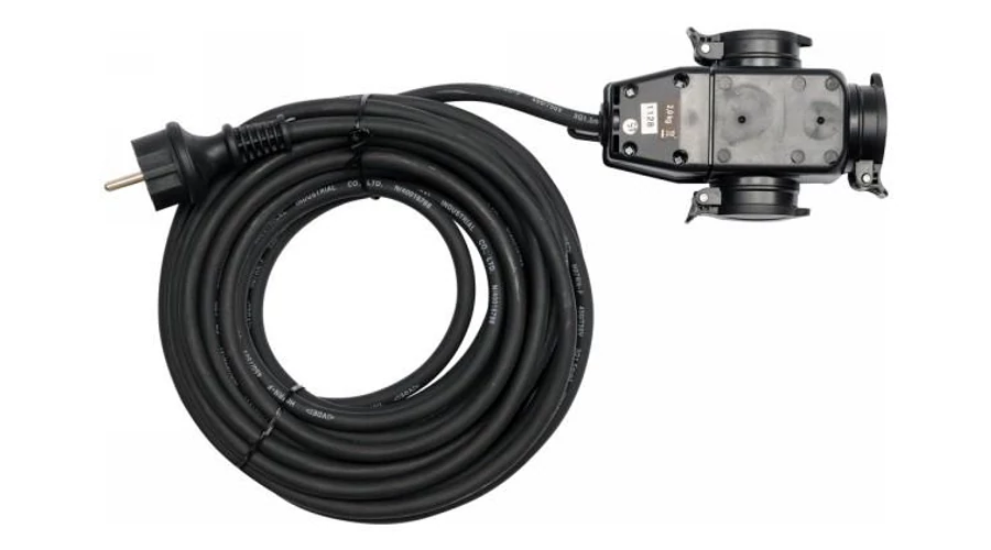 10 m hosszú, szigetelt hosszabbító 3-as elosztóval. A kábel neoprén H07RN-F szigeteléssel van ellátva, ami ellenáll a mechanikai sérüléseknek, a légköri tényezőknek és a vegyi anyagoknak (vágóolaj, benzin, stb.). |