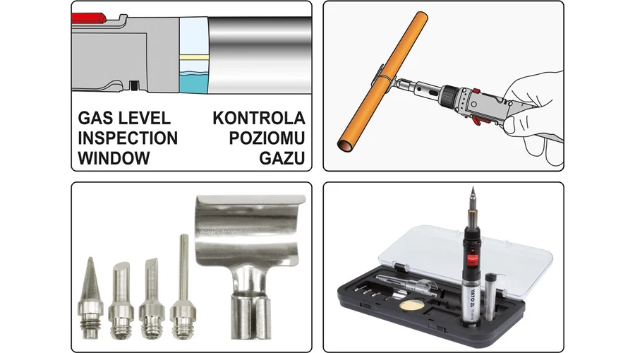 Csomag tartalma:3 az 1-ben fúvóka + forrasztó ón + 4 különböző, cserélhető fej + gáztartály + szivacs