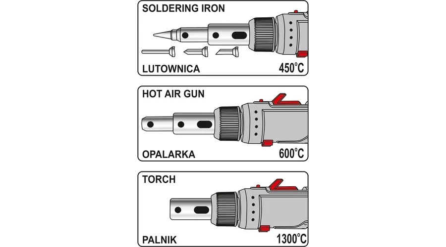 7 részes forrasztópáka készlet, melynek forrasztópáka funkciója max. 450°C, hőlégfúvó funkciója max.600°C, valamint gázégő funkciója max. 1300°C.