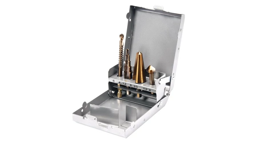 Univerzális fúró készlet HSS acélból hatszög befogással, fém dobozban szállítva. A készlet tartalmaz 1 db marófúrószárat (6x90 mm), 1 db lépcsős lemezfúrót (4-12 mm), 1 db lemezfúrót (8-20 mm), 1 db kúpos furatsüllyesztőt (12,4 mm).