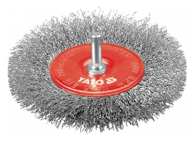 100 mm átmérőjű, rozsdamentes acél drótból készült csapos körkefe. Alkalmas fém felületeken történő rozsda, festék, lakk eltávolítására, csiszolásra és tisztításra.