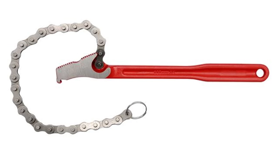 300 mm hosszú, edzett láncszemekből álló, fogazott, acél nyeles láncos csőfogó. 120 mm-es átmérőig állítható. Alkalmas vascsövek megfogásához, mezőgazdaságigépekhez, munka gépekhez és nagyméretű olajszűrők leszedéséhez is.
