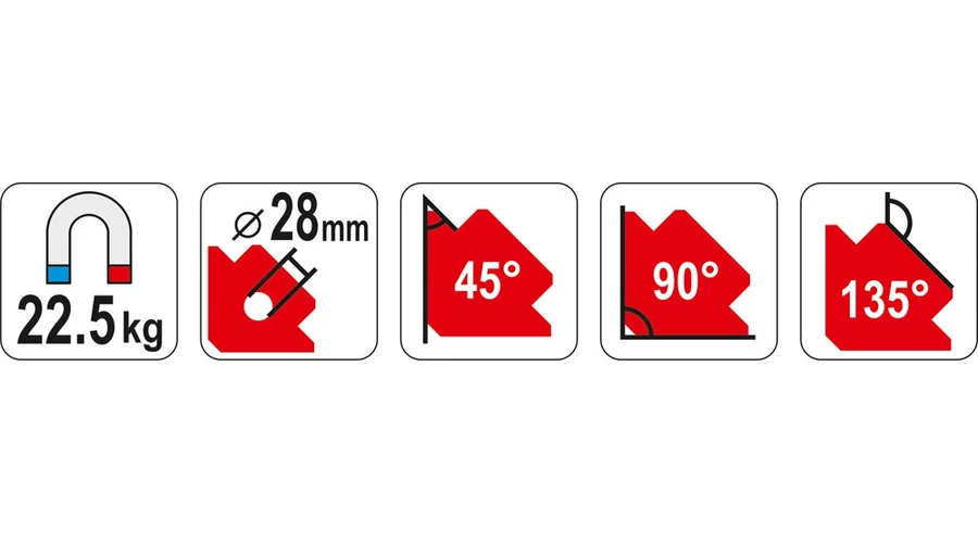 Acéllemezből készült, mágneses tartó, amely lehetővé teszi a munkadarabok pontos összeillesztését 45°, 90°és 135°-os szögekben. Nagyon praktikus, hiszen mindkét kézzel szabadon lehet dolgozni. A felülete porszórással készült. A furat átmérője 28 mm.