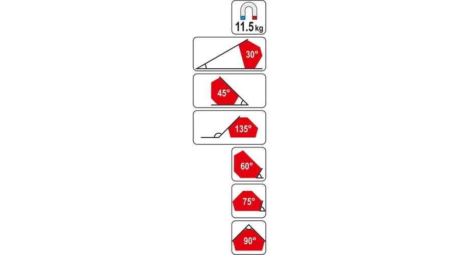 Mágneses munkadarabtartó, amely lehetővé teszi a munkadarabok pontos összeillesztését 30°, 45°, 60°, 75°, 90°és 135°-os szögekben. Teherbírása 11,5 kg. |