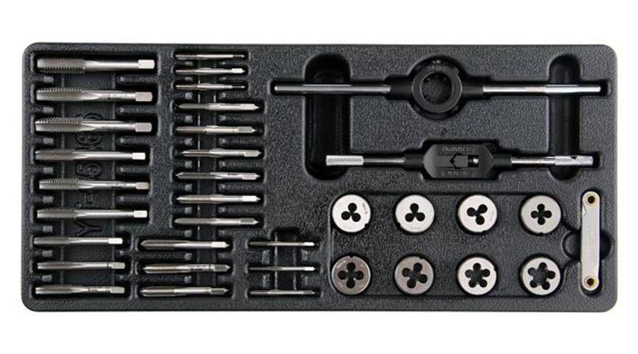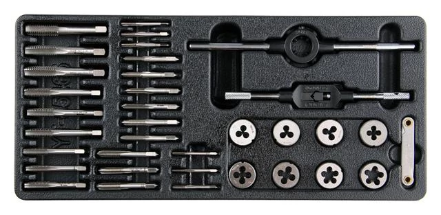 Fiókbetét szerszámkocsikhoz, 35 részes HSS menetfúró és menetvágó szerszámkészlet. |