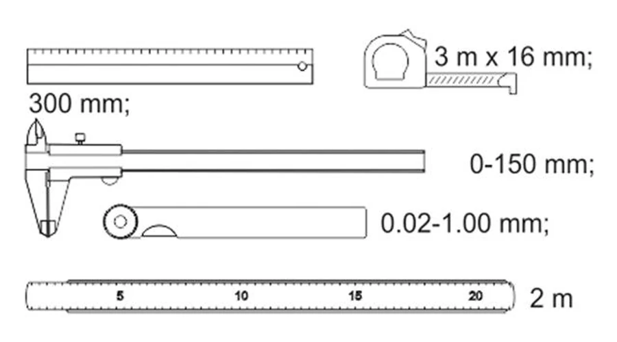 Szállítási terjedelem | 1 db alumínium vonalzó 300 mm + 1 db mérőszalag 3 m/16 mm + 1 db tolómérő 0-150 mm + 1 db hézagmérő 0,02-1,00 mm + 1 db mérőléc 2 m |