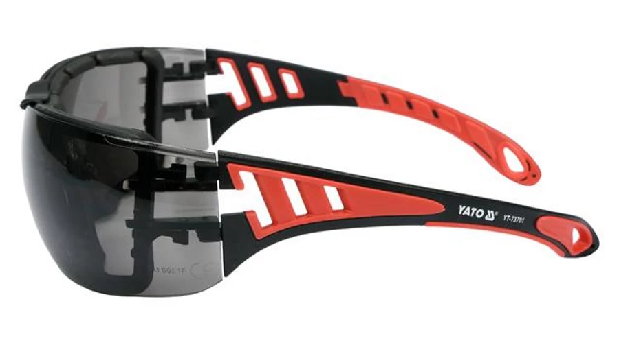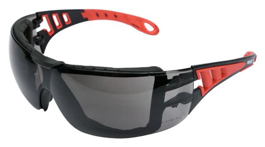 Modern biztonsági szemüveg füstszínű, PVC anyagból készült lencsével és EVA anyagból készült belső kerettömítéssel. Az etilén-vinil-acetát (EVA) anyag alacsony hőmérsékleten is erős és rugalmas anyag, mely ellenáll a fáradás okozta repedéseknek és az UV sugárzásnak, valamint jó vízállósággal bír. A szemüveg kiválóan teljesít a szem szilárd részecskék elleni védelme során, lehet az csiszolás, fúrás, darabolás vagy más, hasonló munkavégzés. Elenáll az akár 86 g-os, 45 m/s -os (F) sebességű ütésnek. Megfelel a CE követelményeknek.