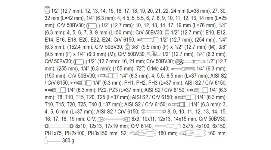 Professzionális szerszámkészlet erős, króm-vandánium acélból.(CrV 50BV3). A kovácsolt szerszámfejeket precíziós mérőeszközökkel kalibrálták. Az AS-Drive rendszerrel ellátott aljzatok 25%-kal növelik a maximális nyomatékot. A készlet tartalmaz S2 acélból készült bitfejeket. Nagy pontosságot és terhelést tesz lehetővé.