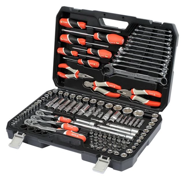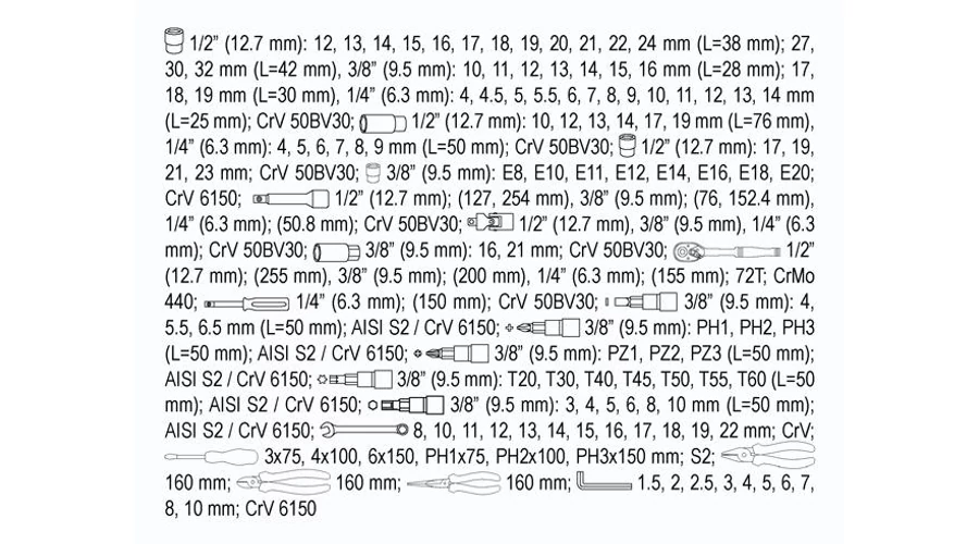 Professzionális szerszámkészlet erős, króm-vandánium acélból (CrV 50BV3). A kovácsolt szerszámfejeket precíziós mérőeszközökkel kalibrálták. A mágneses csavarhúzók CrV acélból készülnek és gumi fogantyúval vannak felszerelve a csúszásmentesség érdekében. Nagy pontosságot és terhelést tesz lehetővé.