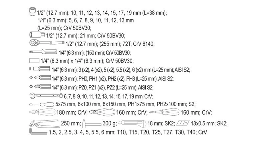 Professzionális szerszámkészlet 1/2" - 1/4"-os dugókulcsokkal és szerszámokkal 0,6 mm-es, horganyzott lemezből készült szerszámosládában, ami a 80 leggyakrabban használt kéziszerszámot tartalmazza. A dugókulcsok CrV50BV30 robusztus szerszámacélból, a 72 fogú racsnis hajtószár CrV6140 acélból, a bitek pedig AISI S2 acélból készültek.
